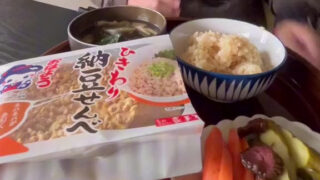 動画で納豆おじさんが食べているのは、小松製菓の「ひきわり納豆せんべ」です。小麦と水を練ったものに白ごまをたっぷり入れた堅めのおせんべいに、乾燥したひきわり納豆をトッピングしたもの。納豆は大豆にこだわった秋田県ヤマダフーズの「おはよう納豆」が...