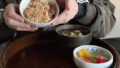 梅太郎さんおすすめの揚げ湯葉とカブの葉の炒め煮と納豆プラス大根おろし。